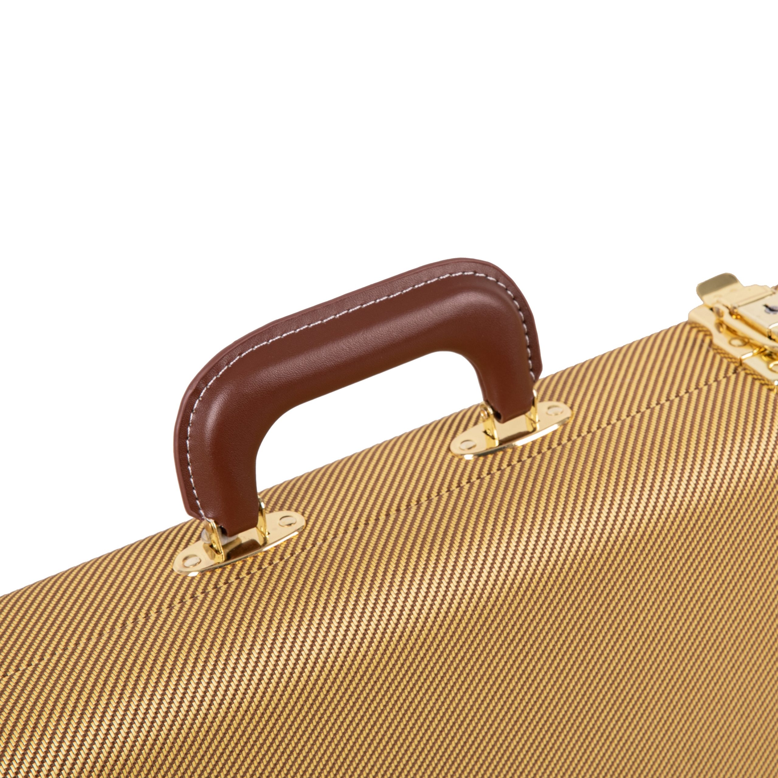 To offer the best protection of your guitar the top and base are constructed in one piece of 5mm wood, with vintage style large radius edges giving greater strength and style than conventional flat top guitar cases. The ends are further enhanced with leather effect covering giving extra style and protection.